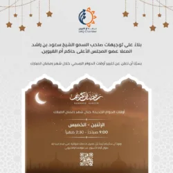 … تعلن غرفة تجارة وصناعة أم القيوين عن تغيير أوقات الدوام الرسمي خلال شهر رمضان المبارك، وذلك بناءً على توجيهات صاحب السمو الشيخ سعود بن راشد المعلا عضو المجلس الأعلى حاكم أم القيوين. يكون الدوام الرسمي خلال شهر رمضان المبارك: • من يوم الإثنين إلى يوم الخميس. • من الساعة التاسعة صباحاً إلى الساعة الثانية والنصف ظهراً. تصبح عطلة نهاية الأسبوع: • من يوم الجمعة إلى يوم الأحد. علماً بأن جميع خدمات الغرفة متوفرة على الموقع الإلكتروني على مدار الساعة طوال أيام الأسبوع. www.uaqchamber.ae Umm Al Quwain Chamber of Commerce and Industry announces that the official working hours will be changed during the holy month of Ramadan, in accordance with the instructions of His Highness Sheikh Saud bin Rashid Al Mualla, Member of the Supreme Council and Ruler of Umm Al Quwain. The official working hours during the holy month of Ramadan are as follows: From Monday to Thursday. From 09:00 AM to 2:30 PM. Weekend are as follows: From Friday to Sunday. Note that all chamber services are available on the website 24 hours a day, 7 days a week. www.uaqchamber.ae