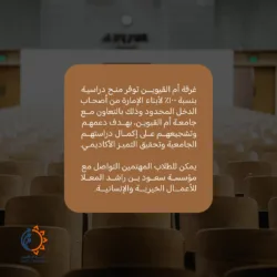 . غرفة أم القيوين توفر منح دراسية بنسبة 100% لأبناء الإمارة من أصحاب الدخل المحدود وذلك بالتعاون مع جامعة أم القيوين، بهدف دعمهم وتشجيعهم على إكمال دراستهم الجامعية وتحقيق التميز الأكاديمي. يمكن للطلاب المهتمين التواصل مع مؤسسة سعود بن راشد المعلا للأعمال الخيرية والإنسانية. #أم_القيوين #استثمر_في_أم_القيوين #غرفة_أم_القيوين #غرفة_التجارة_والصناعة #InvestinUAQ #UAQbusiness #UAQ #UAQChamber #UAQCommerce #uaqindustry